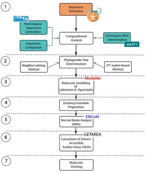 The analysis reported here was performed using a computational approach based on the combination of computational analysis, molecular modelling, normal modes analysis, and molecular docking. Figure 1 highlights the different steps used in the present study to investigate the structure differences between KTS/disintegrins molecules and the molecular docking with the DIα1 of the α1β1 integrin.