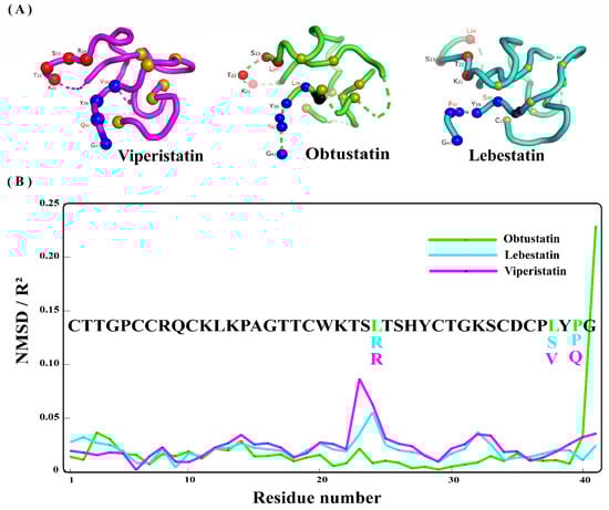 The Elastic Network Model for the KTS-disintegrins. (A) The individual normal modes analysis (animations, RMSD) for Viperistatin, Lebestatin, and Obtustatin. Visual inspection of the 3D structure shows the importance of the flexibility in C-terminals end. (B) Illustration of how the conformation changes between the KTS-disintegrins using the best low-frequency modes.