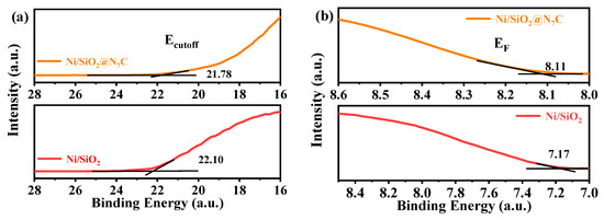 To verify this phenomenon of electron transfer, we employed UPS spectroscopy to measure the work function of Ni/SiO2 and Ni/SiO2@N7C, as shown in Figure 5a,b. The work function has been defined loosely as the minimum energy required to extract one electron from a metal. In other words, the work function can be simply described as the ability of possessing or capturing an electron over an atom. In order to obtain the electronic structure information, the work function was determined by Einstein photoelectric law (Φ = hv − (Ecut off − EF), hv = 21.21 eV), where hv, Ecut off, and EF represent the incident photon energy, the low kinetic energy cutoff edge, and the Fermi energy level, respectively.