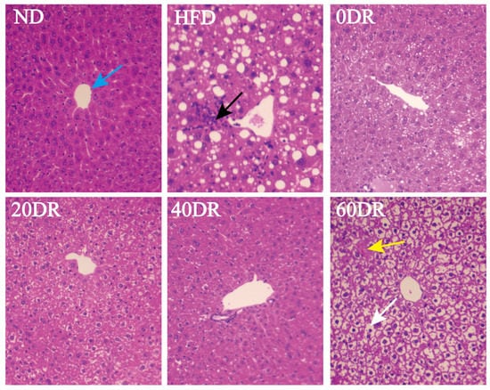 Figure 2 shows the histological examination of the mouse liver using hematoxylin and eosin (HE) staining to explore the effect of DR on hepatic lipid accumulation. Hepatic cells in the normal diet (ND) group exhibited normal hepatocellular architecture with a normal central vein (blue arrow), and the structure of the liver lobule was clear. However, the livers of the high-fat diet (HFD) group showed obvious inflammatory foci (black arrow) and numerous large cytoplasmic lipid droplets (clear spaces). This phenomenon in the 0 DR, 20 DR, and 40 DR groups had improved to different degrees. In contrast, the liver of mice in the 60 DR group was observed with intracytoplasmic vacuoles with hepatic edema (white arrow) and focal hepatocyte necrosis (yellow arrow).