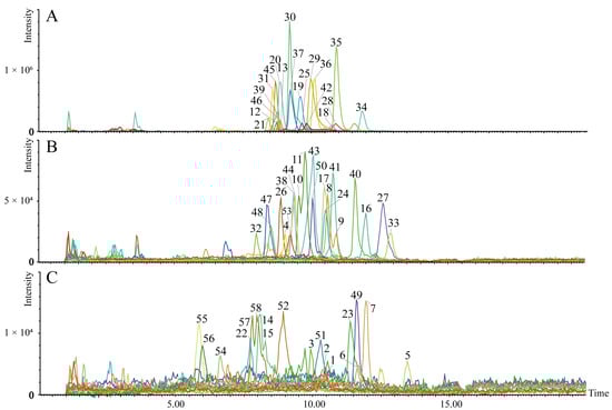 The established metabolite profile of 58 CLs in liver mitochondria. The extracted ion chromatograms (A–C) of the 58 targeted CLs ((A), CLs with peak intensity >1.01 × 105 cps; (B), CLs with peak intensity >2.20 × 104 and <1.01 × 105 cps; (C), CLs with peak intensity >2.18 × 103 and <2.00 × 104 cps). The number on the peak represents the compound number.