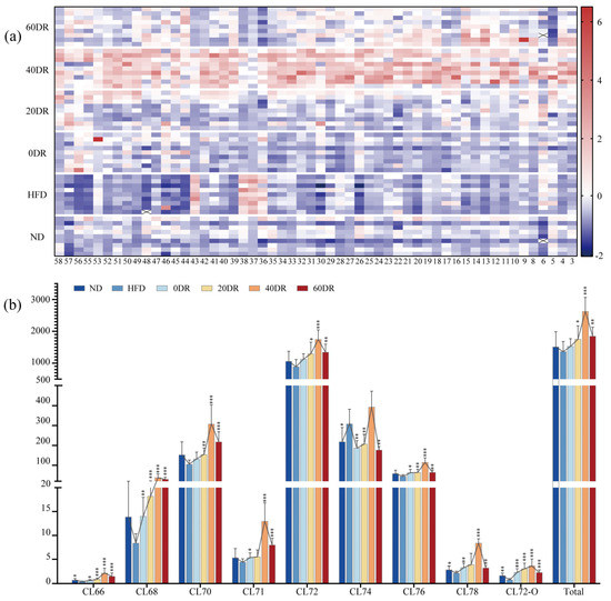 CLs that met the following three criteria were regarded as differential metabolites compared to the HFD group. First, if the VIP values in the corresponding OPLS-DA model were greater than 1.0. Second, if the CL content was significantly different (p < 0.05). Third, if the fold changes of CLs were >1.50 or <0.75. Consequently, a total of 23 CLs were selected in the ND group, including 15, 18, 19, and 18 differential CLs in the 0 DR, 20 DR, 40 DR, and 60 DR groups, respectively. However, when the fold changes were further confined (fold change > 2.0 and fold change < 0.5) to identify CLs with greater variability, there were 10, 10, 17, and 14 differential CLs in the 0 DR, 20 DR, 40 DR, and 60 DR groups, respectively. The VIP, p, and fold change values of the 23 CLs are presented in Table S2.