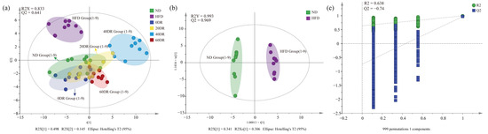 (a) The principal component analysis (PCA) score scatter plot of CL of six group samples. (b) The orthogonal partial least squares discriminant analysis (OPLS-DA) score scatter plots obtained from the ND and HFD groups. (c) The 999-permutation tests of OPLS-DA score scatter plots from the ND and HFD groups.