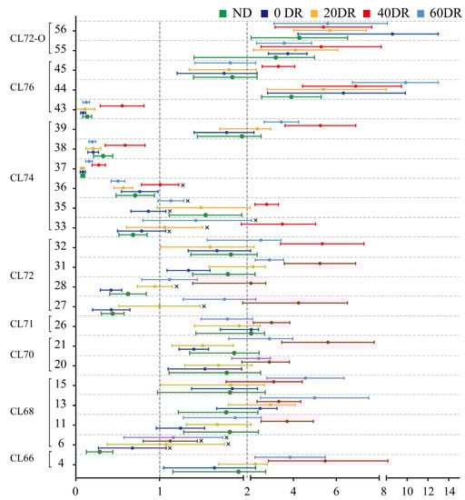 For further quantitative analysis, the changes in the contents of the 23 CLs were analyzed (Figure 6). Each of the 23 CLs in the ND and DR groups was assessed in terms of their basic levels in the HFD group. The points on the right side of the abscissa = 1 indicate that the CL content increased in comparison with the HFD group, and the points on the left side represent the opposite. There was an overall upward trend in CL content after DR. There were several CLs whose contents were clearly reduced in both the ND and DR groups, such as compounds 6, 36, 37, 38, and 43, compared to the HFD group. Most of the differential CLs in the 40 DR group were at the far right of Figure 6, which indicates that 40 DR promoted a greater effect on mitochondrial CL growth than other DR levels.