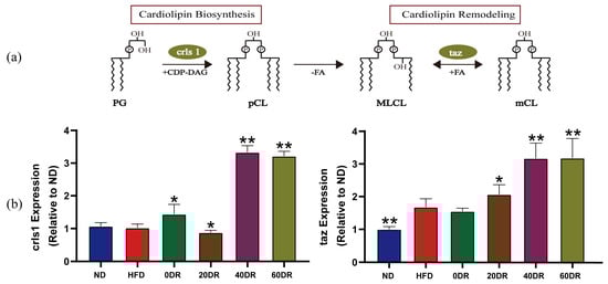 (a) Biosynthesis and remodeling of CL. PG: phosphatidylglycerol; crls1: cardiolipin synthase 1; CDP-DAG: cytidine diphosphate-diacylglycerol; pCL: premature CL; PLA: phospholipase A; FA: fatty acid; MLCL: monolysocardiolipin; taz: tafazzin; mCL: matured CL. (b) Different levels of DR to modulate CL biosynthesis and remodeling (n = 6). The expression of crls1 and taz. Mann–Whitney U test was used to calculate the significant difference. * p < 0.05, ** p < 0.01 significantly different from HFD group.