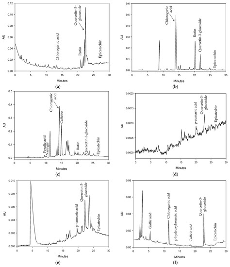 The identification of chlorogenic acid, caffeic acid, gallic acid, quercetin 3-glucoside, epicatechin, and rutin contained in the extracts was carried out by high-performance liquid chromatographic (HPLC-DAD) analysis. The HPLC analysis to determine the relative concentration of single phenolic compounds was performed in a Waters 1525 Separation Module coupled to a Waters 2996 photodiode array detector (Waters Corporation, Milford, MA, USA). Before the injection, all the collected extracts were filtered with 0.45 μm filters. The mobile phase for the determination of the relative concentration of phenols consisted of phosphoric acid (0.1%, eluent A) and methanol (100%, eluent B). The gradient elution program was as follows: 0–30 min from 5% B to 80% B; 30–33 min 80% B; and 33–35 min from 80% B to 5% B. The flow rate of the mobile phase and the injection volume was, respectively, 0.8 mL/min and 5 µL. Chromatograms were acquired at the fixed wavelength by comparing the HPLC retention time and visible absorption spectra with those of the commercial standard.