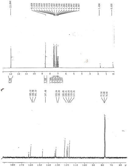 The broad peak for hydroxyl stretch is obscured by the NH band appearance. The azomethine is observed at the expected position. The formation of the ligand is further supported by the NMR spectra. The 1H-NMR of the ligand (H-pimp) revealed a singlet signal assigned for each azomethine moiety and the phenolic hydroxyl group. The rest of the spectrum shows peaks for the aromatic protons. 13C-NMR shows an imine peak at 162 ppm, and the hydroxyl peak at 148 ppm (Figure 1). The Schiff base ligand reacted further with metal ions in a 2:1 molar ratio to produce metal derivatives of the anionic ligand with [M(pimp)2] compositions as shown in Scheme 1.
