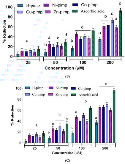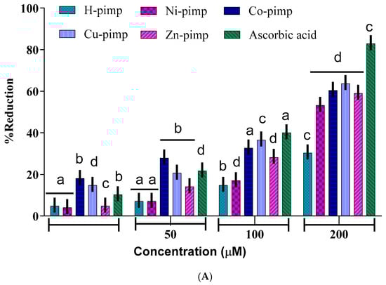 The antioxidant potential of the Schiff base ligand H-pimp and its synthesized metal complexes M(pimp)2 was checked by different assays, including a DPPH-free radical scavenging assay, a ferric ion reducing power assay (FRAP assay), total antioxidant activity (TAA assay) and hydroxyl radical scavenging activity (•OH assay) against ascorbic acid as a standard according to spectrophotometric measurements. The experimental findings presented in Figure 2A–D have shown dose-dependent antioxidant potential for the synthesized compounds. The antioxidant potential data in terms of IC50 values for the studied assays are given in Table 1.