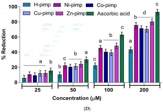 (A) DPPH radical scavenging activity of Ligand and their metal complexes. (Ligand, Ni(II) Complex, Co(II) Complex, Cu(II) Complex, Zn(II) Complex and Ascorbic acid). Mean ± SEM was used to express the values Significantly a p < 0.0006, b p < 0.0017, c p < 0.0027, d p < 0.0086. (B) Ferric ion reducing the activity of Ligands and their metal complexes. Values are expressed as mean ± SEM (triplicate tests were conducted for each sample). Mean ± SEM was used to express the values significantly a p < 0.0006, b p < 0.0017, c p < 0.0027, d p < 0.0086. (C) Phosphomolybdenum assay of Ligand and their metal complexes. Values are expressed as mean ± SEM (triplicate tests were conducted for each sample). Mean ± SEM was used to express the values Significantly a p < 0.0006, b p < 0.0017, c p < 0.0027, d p < 0.0086. (D) Hydroxyl scavenging assay of Ligands and their metal complexes. Values are expressed as mean ± SEM (triplicate tests were conducted for each sample). Mean ± SEM was used to express the values Significantly a p < 0.0006, b p < 0.0017, c p < 0.0027, d p < 0.0086.
