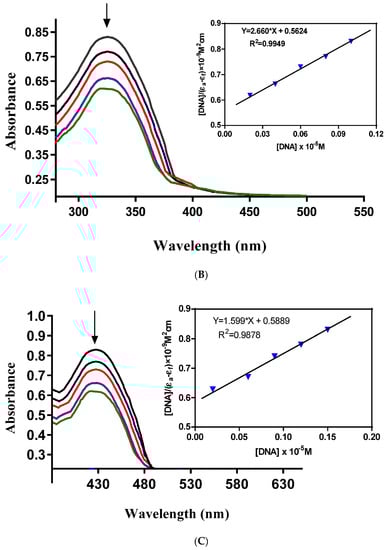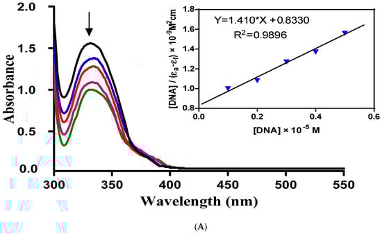 Electronic absorption spectroscopy can be used as a preliminary technique to study the metal complex-DNA interaction. Metal complex-DNA interaction alters UV-Vis spectra of the complexes in terms of λmax shift (blue/red) or intensity changes (hypo/hyperchrpmisim). The extent of wavelength shift or change in absorption intensity shows the strength of interaction. The hypochromisim is associated with a red shift observed in the complex spectra. The increasing concentration of DNA during electronic absorption spectroscopic titrations indicates complex-DNA interaction in the form of intercalation [,]. This interaction is a consequence of stacking interactions between an aromatic chromophore of the complex and the DNA base pairs. After intercalation, the π* orbital of the complexes ligand couple with π orbitals of the base pairs of DNA. This coupling results in a decrease in energy required for π-π* transition and causes a red shift. If the coupling π* orbitals are partially filled by the electrons then transition probabilities also decrease causing hypochromisim [].
