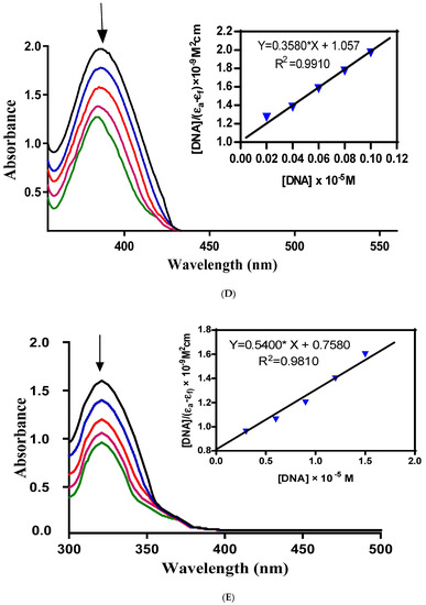 In order to assess the DNA-binding potential of the synthesized Schiff base ligand (H-pimp) and its Cu(pimp)2, Ni(pimp)2, Co(pimp)2 and Zn(pimp)2 complexes, electronic absorption spectral titrations were performed with fixed and variable concentrations of synthesized compounds and DNA, respectively. The results of the spectroscopic titrations are shown in Figure 3A–E and for H-pimp, Ni(pimp)2, Co(pimp)2, Cu(pimp)2 and Zn(pimp)2, respectively, indicating hypochromism associated with a very small red shift with increasing concentrations of DNA solutions, thus indicating intercalation [].