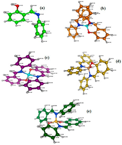 Optimized molecular structures of Schiff base (Z)-2-((phenylimino) methyl)phenol Ligand (a) and their metal (b) Ni(II), (c) Co(II), (d) Cu(II) and (e) Zn(II)) complexes.
