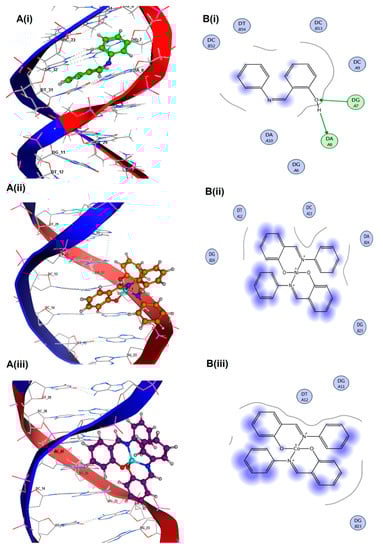 Molecular docked complex of 1D66 with Schiff base (Z)-2-((phenylimino) methyl) phenol Ligand and their metal complexes with Ni(II), Co(II), Cu(II) and Zn(II) {A(i–v)}. 2D ligplot showing interactions of compounds with base pairs of 1D66 {B(i–v)}.