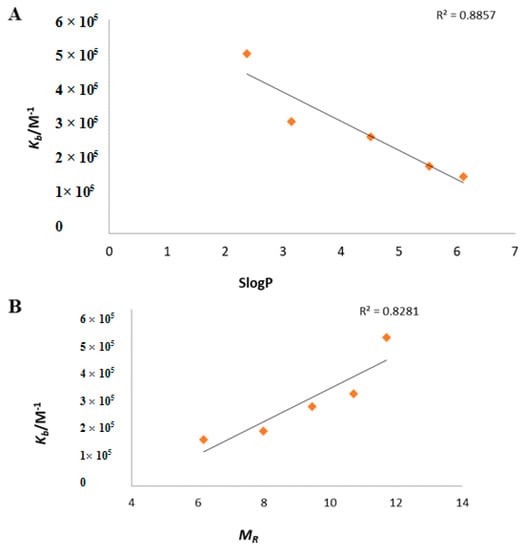 (A) Plot of formation constant Kb vs. Partition Coefficient (SlogP). (B) Plot of formation constant Kb vs. Molar Refractivity (MR).