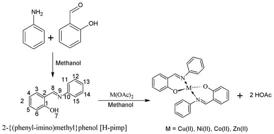 The transition metal complexes of the Schiff base ligand (H-pimp) were synthesized (Scheme 2) by a reported procedure []. The metal salts M(OAc)2 were initially dehydrated by keeping them in an oven for 3–4 h at 110 °C. A methanolic solution of ligand H-pimp (5 mmol) was added to the methanolic solution of metal acetate (2.5 mmol) and stirred for 3 h. The product was obtained either instantly or upon concentrating the solution through a rotary evaporator.