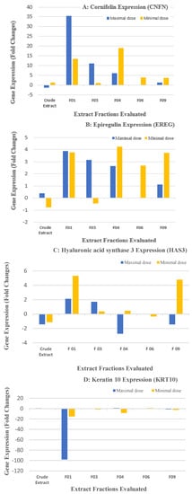A total of 13 fractions were obtained from the crude F. ulmaria extract. The secondary metabolite distribution in the fractions is illustrated in Figure 1. Fractions F01, F03, F04, F06, and F09 were then subjected to epidermal gene expression-modulation tests in the Normal Human Epidermal Keratinocytes for epidermal proliferation, differentiation, barrier function, epidermal renewal, and stress response. Fractions F02, F05, F07, F08, F10, F11, F12, and F13 were not subjected to these tests due to the paucity of the fractions. Fractions F01, F03, F04, F06, and F09 were evaluated at the maximal concentration of 1 g/L and at the minimal dose of 0.2 g/L; the modulation of gene expressions is shown in Figure 3.