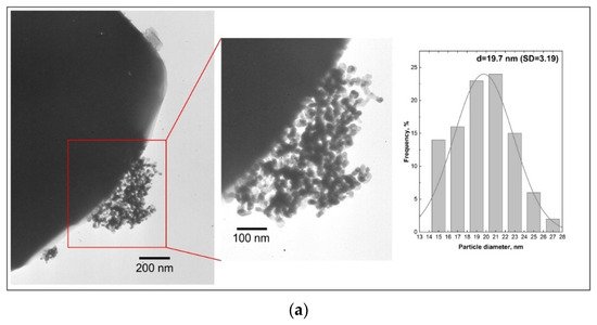 The morphology of the original and the alkali-treated silicalite-1 was studied by scanning and transmission electron microscopies. SEM images show the influence of the type and concentration of modifiers on the morphology of the obtained supports (Figure 4a–d). The unmodified silicalite-1 (Figure 4a) possesses well-formed, separated twin crystals typical for MFI materials with a smooth surface [27].