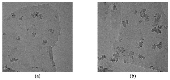 The distribution of TiO2 onto Vt is more visually evident in the TEM images of the composites (Figure 3). It is clearly seen from Figure 3a–f that the density of TiO2 nanoparticles as indicated by the darker grains per unit area on the thinner Vt flakes grows as the TiO2 content in the composite increases. When a certain ratio is reached, the TiO2 nanoparticles start to agglomerate (Figure 3e) or to get over-loaded (Figure 3f). Upon TiO2 saturation as shown in Figure 3f, it is observed that the excessive particles own a higher agglomeration tendency than those loaded on the Vt surface, which is further confirmed via the BET analysis of the composites listed in Table 1. The specific surface area of the composites is reasonably high compared to that of the pure Vt. The presence of TiO2 has a positive effect on the enlargement of the specific surface area of the composites. The higher the relative content of TiO2 in the composite, the larger the specific surface area that can be obtained. When the ratio of TiO2 to Vt reaches 1:2 (Comp.1:2), the surface area of the composites no longer increases, which is ascribed to the particle agglomeration caused by the overloading of TiO2. Further increasing the TiO2 content gives rise to a drop in surface area (Comp.1:0.5), which is due to large-scale agglomeration of excessive TiO2 nanoparticles outside the Vt. A high-resolution TEM image of this composite (Figure 3g) provides the strongest visual evidence of Vt/TiO2 heterostructure formation, in which two different systems of lattice fringes are distinctly observed. The characteristic spacing of 0.351 nm in the image center is assigned to the (101) lattice plane of anatase TiO2, while the fringe distance of 0.459 nm around the TiO2 particle originates from Vt, which is determined via the XRD analysis above. As indicated by the red circles in Figure 3g, the prepared TiO2 nanoparticles with the size of about 10 nm are incorporated onto Vt layer, building heterostructure between them. The Vt/TiO2 heterojunction formed would facilitate the electron transfer as well as the photo-generated carriers separation, endowing the composite material a superior photocatalytic performance. Figure 3h presents the selected area electron diffraction (SAED) pattern of the composite (Comp.1:5), exhibiting intermittent circles and corresponding to the (101), (112), (200), and (211) diffraction planes of TiO2, respectively, which are well consistent with the XRD measurements and suggest the polycrystalline nature of the prepared TiO2.