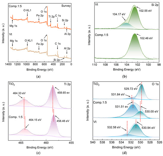 XPS measurements were carried out on Vt, TiO2 and their composite material (Comp.1:5) to reveal the chemical composition and the surface electronic structure (Figure 5). In the survey scans, as shown in Figure 5a, the peaks representing elements Si, Mg, Al, Fe, O, C appear in both Vt and composite samples, confirming the constituent components of Vt. The presence of the additional Ti peak in the composite sample verifies the successful incorporation of TiO2 onto Vt. The high resolution Si 2p spectra of Vt in Figure 5b can be deconvoluted into two peaks, a primary peak at 102.55 eV and a secondary peak at 104.17 eV, corresponding to the Si-O bonds of aluminosilicate structure and the Si bonds connected with the surface hydroxyl groups in Vt, respectively. Compared with Vt, only the Si characteristic peak at 102.46 eV in the SiO2 tetrahedra is reflected in the composite, and the Si bonds associated with the surface hydroxyl groups at higher binding energy disappear in the composite. It is speculated that the disappearance of Si-O peak at higher binding energy is attributed to either the reaction of Si-OH on the surface with TiO2 to form Si-O-Ti bonds or the loss of hydroxyl groups due to the high temperature calcination of the composite [20,21]. As shown in Figure 5c, the peaks at 458.65 eV and 464.33 eV correspond to Ti4+ 2p3/2 and Ti4+ 2p1/2 in TiO2, respectively [22]. In comparison with pure TiO2, the Ti 2p peaks in the composite display a small shift of about 0.18 eV towards lower binding energy, indicating that the valence state of Ti element in TiO2 is reduced. Figure 5d shows the high resolution O 1s spectra of TiO2, Vt and their composite. The O 1s spectrum of TiO2 can be resolved into two components, a main peak at 529.72 eV and a broad peak at 531.84 eV, which are assigned to the lattice O2- bond and a very small amount of oxygen vacancy in TiO2, respectively. In contrast, the O 1s spectrum of Vt can also be fitted into two peaks at 530.94 eV and 532.58 eV, which are assigned to the O-metal bonds of aluminosilicate and surface adsorbed water molecules, respectively [23]. When TiO2 nanoparticles are covered onto the Vt substrate, it is worth noting that both the lattice O2− bonds in TiO2 and the O-metal bonds of aluminosilicate in Vt exhibit appreciably positive shifts of 0.28 eV and 0.57 eV, respectively, which reveals that the electrons of the O site are attracted and transferred from Vt to TiO2, enriching electron density in TiO2 and favoring its photocatalytic activity. The incorporation of TiO2 onto Vt promotes the electron-donating ability of O sites in Vt, and results in higher valence states, enabling the composite to generate strong electronic interactions between Vt and TiO2 nanoparticles. Carbon is ubiquitous and will contaminate surfaces of all samples during the XPS analysis. Therefore, the carbon C 1s peak at 284.8 eV is commonly used as a reference for charge correction. Figure 5e illustrates the C 1s peaks of surface-contaminated TiO2, Vt, and their composite. All spectra can be fitted into three peaks located at 284.8 eV, 286.2 eV, and 288.9 eV, which are associated with C-C, C-O, and C=O bonds, respectively. It is worth noting that the content of C-O in Vt is much higher than that in TiO2 and the composite, suggesting a reduction of C-O bonds after the incorporation of TiO2 into the composite, and thus indicating that there is a considerable number of C-O bonds formed through water molecules’ participation in the Vt break, which are rearranged to Vt-O-Ti bonds after the TiO2 addition and calcination. This analysis is in good agreement with those of the Si and O spectrum variations.