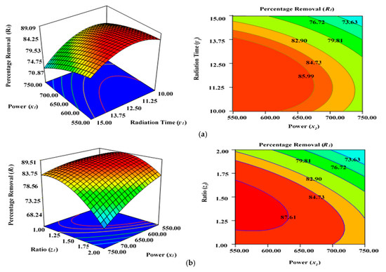 The linear variables of power (x1), time (y1) and ratio (z1), interaction terms x1y1 and y1z1, and also their quadratic terms y12 and z12, were significant for the response of removal percentages, R1. In comparison to power (x1), other linear factors such as time (y1) and ratio (z1) had a moderate effect on the elimination percentages (R1). The interaction between power and ratio (x1z1) had a stronger influence on removal percentages, R1 (according to the greatest value of F = 30.09) than the remaining interaction variables of y1z1 and z1 × 1.