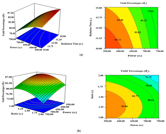 Three-dimensional RSM surface mesh plots with respective 2D contour plots for yield percentages (R3): (a) effect of microwave power (x1) and radiation duration (y1) when impregnation ration (z1) was kept consistent at the centre/zero level (1.5), (b) effect of power (x1) and ratio (z1) when radiation time (y1) was kept constant at the centre level (12.5 min), (c) effect of duration (y1) and ratio (z1) when power (x1) was fixed at the centre point (650 watts).
