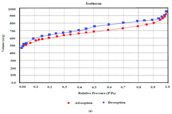 N2 adsorption–desorption curves reveal qualitative feedback on the adsorption capacity and porosity of the carbonaceous substrate. The N2 adsorption isotherm assessment (Figure 7a) revealed that the isotherm obtained here for AKTWAC can be classified as an intermediate between Category I and Category II isotherms, designated by the International Union of Pure and Applied Chemistry (IUPAC) association. This adsorption pattern indicates a hybrid structure containing both micro- and meso-porous texture. At relatively higher pressures, the isotherm curve exhibits a small hysteresis loop, indicating a meso-porous texture.