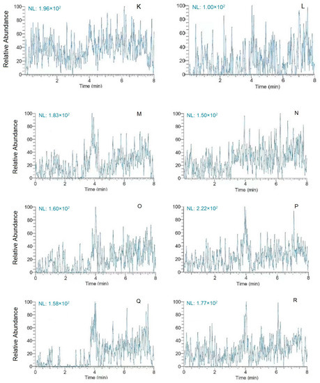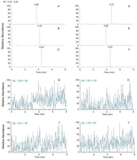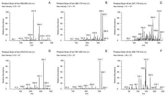 A VanquishTM Flex ultra-HPLC System coupled with a TSQ AltisTM Triple Quadrupole MS Instrument (Thermo Fisher Scientific, Waltham, Massachusetts USA) was used for all analyses. Briefly, samples (5 μL) were spiked into a Poroshell 120 EC-C18 (column temperature 45 °C). Elution was performed using 5 mmol/L ammonium acetate–water (A) and acetonitrile (B) at a 0.3 mL⋅min−1 flow rate using the following settings: 0–1.0 min 20% B; 1.0–3.0 min, linear gradient from 20–90% B; 3.0–6.0 min, 90% B; 6.0–6.1 min, 90–20% B; 6.1–8.0 min, 20% B. The relevant MS parameters were positive mode electrospray ionization source (ESI+); selection reaction monitoring (SRM). Mass transitions of the RF Lens, CE, and RT, are presented in Table 5. Product spectra for each analyte are presented in Figure 5. The chemical structure and possible fragmentation pathways of each compound are shown in Figure 6.