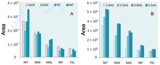 Different acetonitrile volumes were next combined with samples, given the optimized extraction reagent usage. As shown in Figure 2B, the use of 2 mL of acetonitrile yielded larger peak area values.