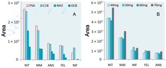 To better optimize absorbant dosing, four different amounts of PSA (40, 50, 60, and 70 mg) were tested. For these five CCBs, the most prominent peak areas were observed for nitrendipine, nimodipine, and amlodipine when using 70 mg of PSA. In contrast, better responses were observed for the other drugs when using 50 mg of PSA. When pretreatment was performed using 70 mg of PSA, nifedipine and felodipine exhibited smaller peak area values than when 50 mg of PSA was added. As such, 70 mg of PSA was used as an adsorbent in subsequent analyses of these five CCBs (Figure 3B).