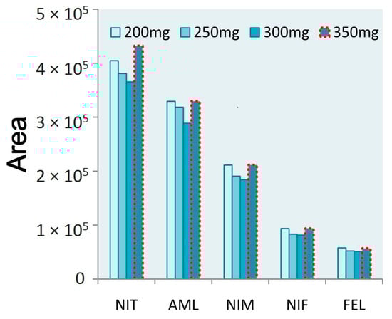 Based on the results of this study, anhydrous MgSO4 was selected as the salting agent. Different concentrations were selected for extraction (250, 300, 350, and 400 mg), with optimal results established based on area values. The highest CCB peak responses were evident when using 350 mg of anhydrous magnesium sulfate. A slightly less pronounced peak response was observed at a 200 mg dose. As the extraction dose was the most critical factor, a salt dose of 350 mg was selected (Figure 4).