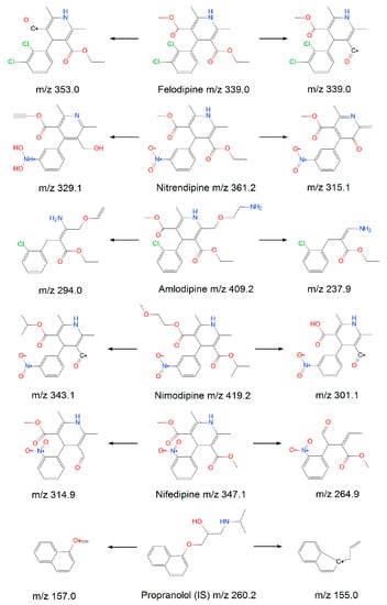 Product ion mass spectra of amlodipine (A), felodipine (B), nifedipine (C), nimodipine (D), nitrendipine (E) and IS-propranolol (F) in positive mode.