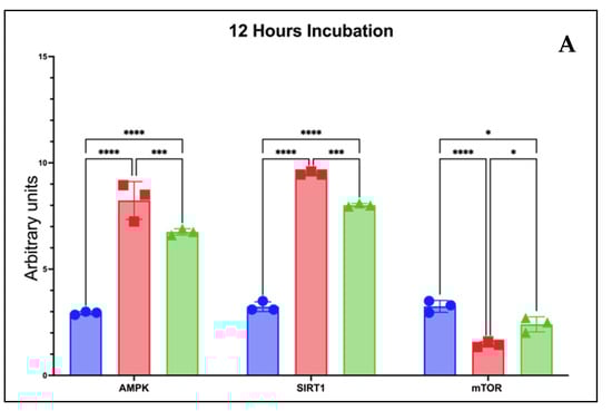 Changes in protein expression of the mTOR/AMPK/SIRT1 pathway were also observed in vitro, and the data from MANOVA analysis are in Figure 2. Figure 2A shows significant activity (p < 0.05) of both CS in upregulating of AMPK/SIRT1 and downregulating of mTOR expressions at 12 h incubation. Interestingly, in rCSE which is also aligned with the results of its antioxidant activity, it is more significant in modulating the mTOR/AMPK/SIRT1 pathway at 12 h incubation. Still in line with the modulation results at 12 h of incubation, both CS showed modulation activity of AMPK/SIRT1/mTOR expressions and rCSE still led it at 24 h of incubation (Figure 2B).