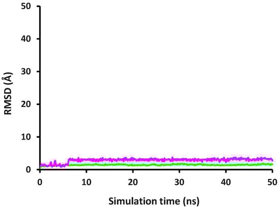 RMSD alterations of MMP-9 backbone atoms complexed with caffeic acid (green) and RMSD ligand movement of caffeic acid (purple) during 50-ns simulations.