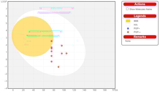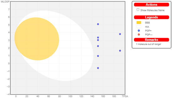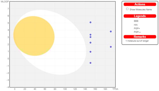 Most drugs fail at the clinical trial stage or are withdrawn from the market due to the negative properties of ADME (absorption, distribution, metabolism, and excretion) and unavoidable side-effects. The in silico prediction of ADME properties can reduce the effort and time needed by investigators to make models for every new derivative in the development of a lead compound []. Swiss ADME can help to determine the different physicochemical properties of novel tested compounds such as molecular weight, hydrogen bond donors (HBDs), hydrogen bond acceptors (HBAs), partition coefficient (log P), and solvent-accessible surface area within a desired range of acceptance. All novel derivatives of metformin had the ability to cross the gastrointestinal layer, and only one derivative (MET-7) could cross the blood–brain barrier (BBB). All novel derivatives exhibited log S under the predicted value (−6.5 to 0.5). All derivatives followed Lipinski’s rule of five and were freely soluble in aqueous media. Therefore, according to the overall physicochemical prediction, most derivatives possessed drug-likeness behavior. No derivatives of copper and zinc could cross the blood–brain barrier, and they had low affinity for gastrointestinal absorption.