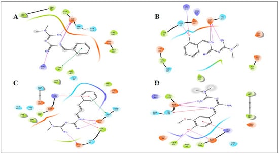Induced fit docking study of the best pose generated on α-amylase (5E0F): (A) Met1 ligand-binding site; (B) Met2 ligand-binding site; (C) Met3 ligand-binding site; (D) Met8 ligand-binding site.