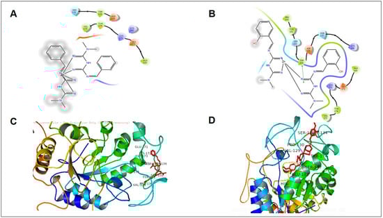 A total of 27 ligands were docked to the enzymes. The interactions of the receptors α-amylase and α-glucosidase with the ligands are shown in Figure 4, Figure 5, Figure 6, Figure 7 and Figure 8, while the binding affinities and binding forces of the ligands and enzyme are reported in Table 10 and Table 11.