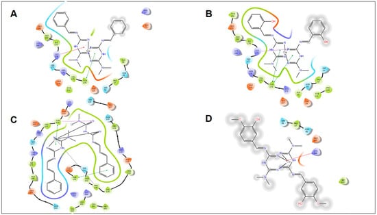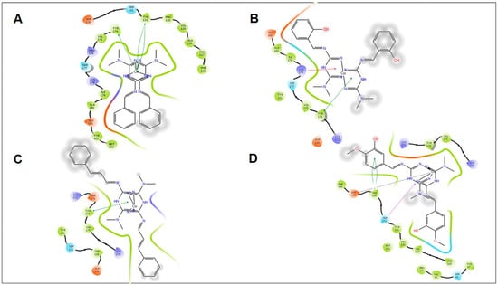 Induced fit docking study of the best pose generated on α-glucosidase: (A) MCu1 ligand-binding site; (B) MCu2 ligand-binding site; (C) MCu3 ligand-binding site; (D) MCu8 ligand-binding site.