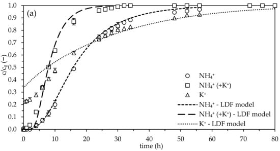 With regards to the breakthrough curves for NH4+, both the LDF and Thomas models were successfully validated—the modeled breakthrough curves of NH4+ were in close agreement with the experimentally obtained breakthrough curves. For K+, the modeling was not as accurate. The LDF model did not adequately describe the breakthrough curve for K+ during the first 16 h, whereas the Thomas model was inadequate to describe behavior after 24 h. Furthermore, it was not possible to maintain a typical S-shape breakthrough curve for K+ using the LDF model. The nonlinear Thomas model fitting provided a much better S-shape breakthrough curve for K+. To obtain a better fitting of the Thomas model, mainly in the first 6 h, the empty bed contact time (EBCT) should be increased in future studies—2–5 min EBCT are recommended for drinking water treatment applications [28].