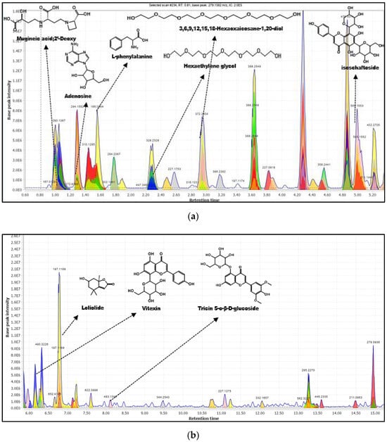 As shown in Table 1, the above processing of the extract managed to annotate 12 phytochemicals based on the custom-built database (LR and DNP sourced). Three of the phytochemicals were detected at several different retention times, namely, loliolide (1, 1′), isoschaftoside (2, 2′), and adenosine (5, 5′); they were assigned the same acronym but with the addition of prime (‘) to the duplicate to ease confusion. This redundancy in detection is probably due to the stereoisomerism of the compounds, which may affect their polarity [22]. Notably, MS spectra typically cannot differentiate the stereoisomers, and additional experiments, including comparison with standards, are required to assign the absolute structure [23]. The annotated phytochemicals, loliolide (1, 1′), isoschaftoside (2, 2′), and vitexin (3) were hit with the custom database developed through the LR, and 4-ethoxy-6-methoxy-2-(8,11,14-pentadecatrienyl)-1,3-benzenediol,5-Ethoxy-3-(10,13,16-heptadecatrienyl)-1,2,4-benzenetriol (4), oryzamutaic acid E (7), 1-feruloyl-2-hydroxyputrescine (8) and 2-[2-(3-Methoxyphenyl) ethenyl]-4H-3,1-benzoxazin-4-one, 2-(3-methoxycinnamoyl)-4H-3,1-benzoxazin-4-one (9) were detected using the enriched database from DNP. Adenosine (5, 5′) was hit by both LR and DNP sourced. Of these annotated phytochemicals, only 2 and 3 have been previously reported as the constituents of E. indica [14,20,24]. Since the LR database was only focusing on secondary metabolites, it seems that the DNP database complemented it by annotating some common compounds and primary metabolites from the plant extract. All the phytochemicals annotated in MZmine were identified with confidence level 3 due to only MS1 data characterization [25,26]. To acquire a higher level of confidence, the structures must be further characterized with their MSn using GNPS, CD and SIRIUS platforms.