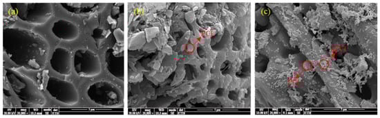SEM images of BC (a), PBC (b), and nZVI@PBC (c).