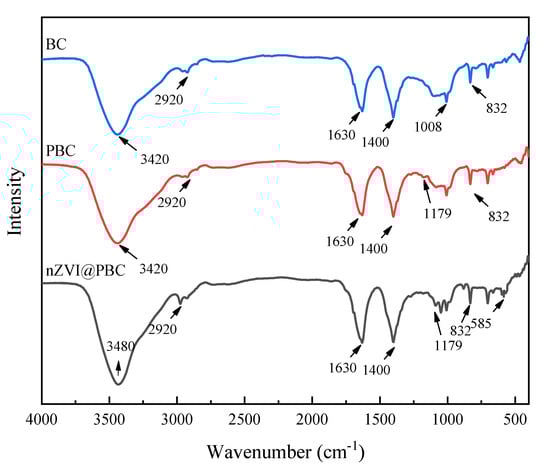 The surface functional groups of BC, PBC, and nZVI/@PBC were characterized by FT-IR (Figure 2). BC exhibited abundant surface functional groups. Typically, a broad peak at approximately 3420 cm−1 corresponded to the O-H band, indicating that some hydroxyl groups were existed on the BC surface []. The peak at 2920 cm−1 was related to the C-H band of long-chain aliphatic components []. Peaks around 1630 cm−1 and 1400 cm−1 are assigned to stretching vibrations of C=C and C=O on the aromatic structures []. The weak bands at about 1008 cm−1 (C-O) and 832 cm−1 (C-H) were due to the phenols and furans in the aromatic rings, respectively []. Aside from these characteristic peaks, the FT-IR spectra of PBC showed a new peak at 1179 cm−1 (C=O), which can be attributed to the presence of PCL []. This indicates that PCL was successfully loaded onto BC. Compared to BC and PBC, a blue or red shift in most bands was observed in nZVI@PBC. For instance, the O-H band shifted from 3420 cm−1 for PBC and BC to 3480 cm−1 for nZVI@PBC, implying the bonding of nZVI with PBC []. Additionally, there was a new peak at 585 cm−1, which corresponded to Fe-O stretching, indicating that nZVI on the PBC surface was partially oxidized to form high-valent iron oxidants []. This is in agreement with the TEM result.