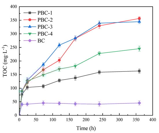The carbon-releasing performances of the four PBCs in sterile pure water are shown in Figure 4. Compared to BC, the TOC concentration in the water with PBCs increased slowly and continuously, being consistent with the carbon-releasing trend of the PCL-peanut shell carbon composite produced by Xiong et al. []. This indicates that PCL loading could improve the slow carbon releasing performance of the composite. After 360 h, the TOC concentrations in PBC-1, PBC-2, PBC-3 and PBC-4 treatments were 161.33, 297.61, 281.56 and 243.35 mg·L−1, respectively. The carbon amount released from PBC-4 with the highest PCL content was relatively lower compared to those released from PBC-2 and PBC-3. This might be because the excessive PCL would result in agglomeration on the BC surface, thus inhibiting the carbon-releasing efficiency of PBC. Hence, with comprehensive consideration of the SEM, BET and carbon releasing experiment results, the optimal mass fraction of PCL in PBC was determined to be 12.5%.