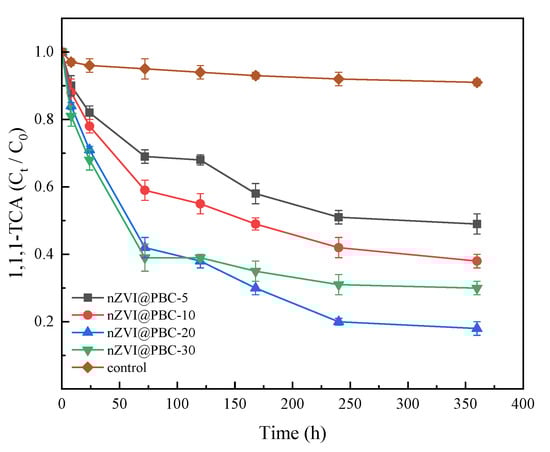 The synergy effects of the four composites and Shewanella putrefaciens CN32 on the removal of 1,1,1-TCA (100 mg·L−1) from simulated groundwater are shown in Figure 5. At the end of the culture period, the removal rate of 1,1,1-TCA in the different composite treatments (58.79–75.27%) was significantly higher than that in the control group without composite addition (12.3%). This indicates that the composites produced in this study had good performance on 1,1,1-TCA removal from groundwater. Specifically, the 1,1,1-TCA concentration in the composite treatments declined obviously within 72 h, and the declined degree increased with increasing nZVI mass fraction. This is because that nZVI can achieve rapid dichlorination of 1,1,1-TCA in a short period due to its strong chemical reduction ability, and the reduction rate is proportional to the nZVI dosage []. After 72 h, the decline of 1,1,1-TCA concentration in the composite treatments slowed down. The reason is considered that nZVI has been almost depleted in the early stage of the reaction, and thus the 1,1,1-TCA removal is predominantly induced by the CN32-mediated reductive dichlorination []. Meanwhile, the residual concentration of 1,1,1-TCA in nZVI@PBC-20 treatment after 72 h was obviously lower than those in the other composite treatments. Because of the low nZVI content in nZVI@PBC-5 and nZVI@PBC-10, the chemical reductive dechlorination was relatively weak in the two treatments, thus resulting in high residual concentrations of 1,1,1-TCA in the early reaction stage. This subsequently had toxic effect on CN32, inhibiting its activity of dissimilatory iron reduction. On the other hand, although nZVI content was the highest in nZVI@PBC-30, the BC and PCL contents were relatively low compared to those in other composites, thus weakening its stimulation on CN32 growth. Furthermore, the agglomeration of excessive nZVI in nZVI@PBC-30 might also decrease its chemical reductive dechlorination capacity [].