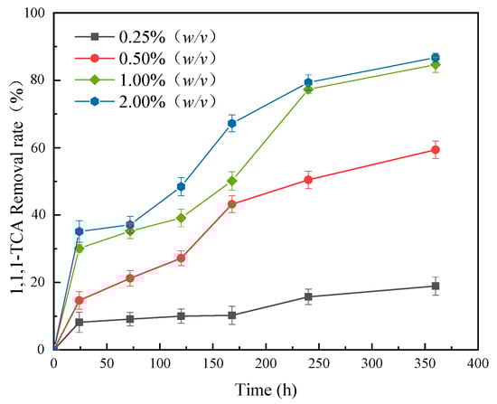 The synergy effects of the composites with different dosages coupling with CN32 on 1,1,1-TCA removal from simulated groundwater are shown in Figure 6. The removal rate of 1,1,1-TCA increased with increasing composite dosage. When dosage increased from 0.25% (w/v) to 2.00% (w/v), the removal rate of 1,1,1-TCA in the simulated groundwater increased from 18.92% to 86.73% after 360 h. As mentioned above, this is because the chemical reductive dechlorination of nZVI and the stimulation of BC and PCL on the activity of CN32 were relatively weak when the composite dosage was less. However, the increasing degree of removal rate slowed down when the composite dosage exceeded 1.00% (w/v), indicating that the pollutant removal capacity of the composite tended to be stable with further increasing the dosage. Taking 1,1,1-TCA removal and preparation costs into account, the optimal composite dosage was determined to be 1.00% (w/v).