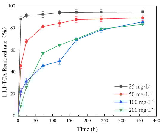 Effects of 1,1,1−TCA concentration on 1,1,1−TCA removal (mass fraction of nZVI: 20%; composite dosage: 1.00% w/v).