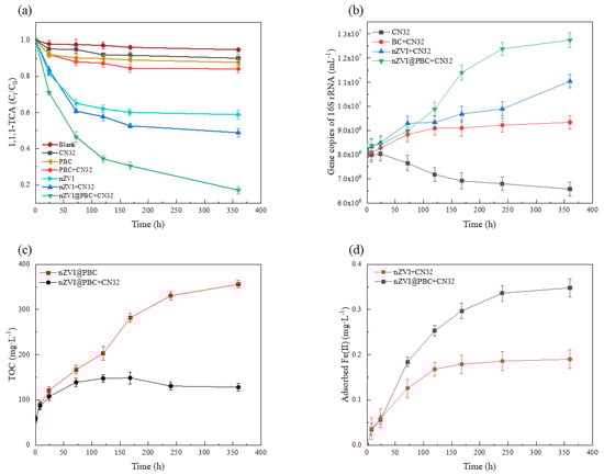 To preliminarily explore the mechanism of 1,1,1-TCA removal by the composite coupling with CN32, variations in 1,1,1-TCA, TOC and adsorbed Fe(II) concentrations, and 16S rRNA copy numbers of CN32 in nZVI@PBC + CN32 and other control treatments over time were analysed (Figure 8). The dosage of nZVI@PBC was 1.00% (w/v). The dosages of PBC and nZVI in other control treatments were consistent with their contents in nZVI@PBC + CN32 treatment. The initial concentration of 1,1,1-TCA in all treatments was 100 mg·L−1.