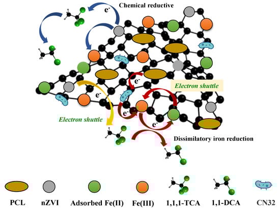 According to the above results, it can be concluded that the mechanism of 1,1,1-TCA removal enhanced by nZVI@PBC coupling with CN32 was a comprehensive result of the synergism of components in the composite (Figure 9). In the early stage, the rapid chemical reductive dichlorination induced by nZVI is the main pathway to remove 1,1,1-TCA. After the depletion or oxidation of nZVI, the CN32 growth is promoted by BC as a colonization supporter and PCL as a slow-releasing carbon source, meanwhile, the electron transfer in the synergy system is also accelerated by BC as an electron shuttle. These can obviously stimulate the pathway of dissimilatory iron reduction mediated by CN32, thus facilitating the dissolution of the Fe(III) (hydr)oxides passivation layer on the surface of nZVI@PBC and extending its reactivity by the formation of adsorbed Fe(II) as a strong reductant. The above synergism finally achieves the high-efficiency and long-term removal of 1,1,1-TCA by the studied composite.