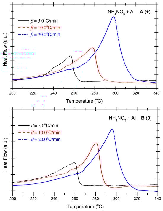 Figure 4 presents the DSC curves of the non-ideal explosive composed of ammonium nitrate and aluminium powder under the various OB conditions. As indicated in Figure 4, under positive OB, zero OB, and negative OB conditions, the curves of the non-ideal explosive composed of ammonium nitrate and aluminium powder tend to be similar. In other words, with the increase in the heating rate, the exothermic peak temperatures of the three curves incline towards higher levels. Moreover, as the exothermic peak increases with the heating rate and inclines to become steeper, the heat release of the system mounts gradually. As shown in Figure 2, which deals with the ammonium perchlorate–aluminium system, the ammonium nitrate–aluminium system exhibits a steeper curve, which means the heat release process is more violent and rapid. Table 4 summarizes the characteristic peak temperatures of the DSC curves of the ammonium nitrate-aluminium system at different heating temperatures. As seen in Table 4, all peak temperatures (Tp) incline to a higher level as the β-value increases. In order to quantitatively analyze the phenomenon, we can compute the thermokinetic parameters of the non-ideal explosive composed of ammonium nitrate and aluminium under different OB conditions.