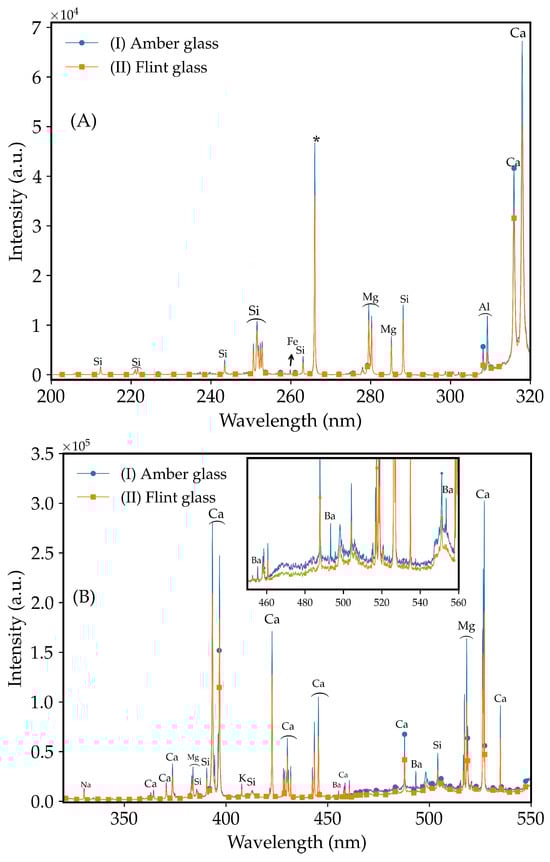 LIBS spectra for sintered (I) amber and (II) flint waste glass. Spectral range: (A) 200–320 nm ((*) denotes the laser line), (B) 320–555 nm (inset graphic: selected region showing Ba lines), and (C) 555–850 nm. Peaks under ⌢ (arc) symbol are attributed to the element above.