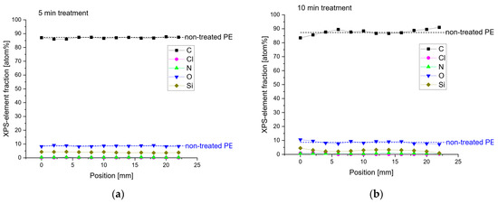 Figure 6 shows the results of the XPS analysis used to study the degree of chemical modifications on the surface of substrates within a depth range of 5.0 to 10.0 nm. This technique evaluates surface oxidation and the percentage of atomic species on the PE surface. For this purpose, the sum of C, O, N, and Si was assumed to be 100 at%, meaning that the proportion of H in the calculations was neglected. The untreated PE reference contains 87 at% C, 9 at% O, 4 at% Si, and traces of N and Cl, indicating significant contamination by O, Si, Cl, and N from unknown sources. The O/C ratio of this reference material is 10%, and the N/C ratio is 0.5%. Figure 6a–c show the elemental fractions in samples after 5, 10, and 15 min of APD treatment, respectively. Compared to the untreated PE, the elemental composition of PE after 5 min of plasma treatment did not change significantly. After 10 min of plasma treatment, the elemental composition changed only slightly.